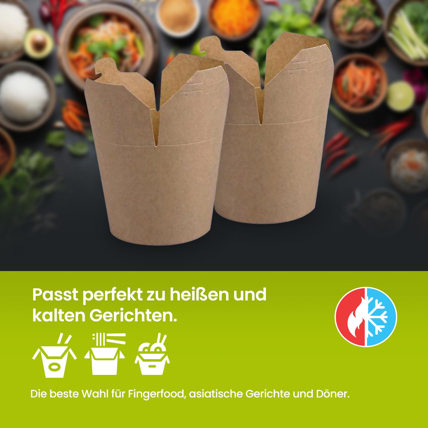 Die Asia-Box „Kraft-K“ ist die perfekte Verpackungslösung für Snacks wie Asia-Gerichte, Döner oder Wok to Go. Gefertigt aus robustem Karton mit auslaufsicherer PE-Beschichtung auf der Innenseite, bietet sie zuverlässigen Schutz für warme und kalte Speisen – egal ob unterwegs, zu Hause oder im Büro.