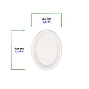 Der ovale Teller aus Zuckerrohr mit den Maßen 310 x 250 mm ist eine biologisch abbaubare und kompostierbare Alternative zu herkömmlichem Einweggeschirr. Er eignet sich ideal für Catering, Events, Foodtrucks und alle, die Wert auf nachhaltige Produkte legen.
