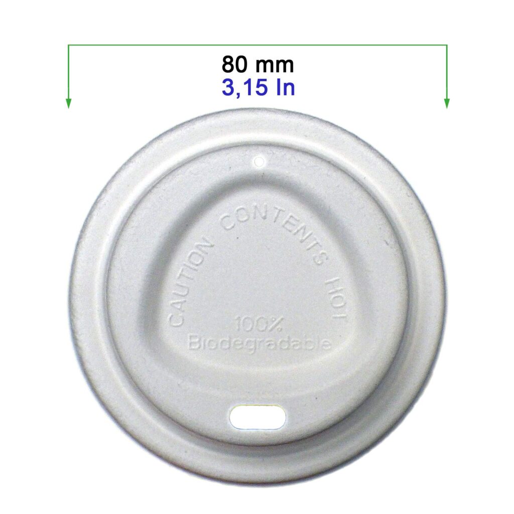 Der Zuckerrohr-Deckel mit 80 mm Durchmesser passt ideal auf Pappbecher mit einem Volumen von 250 ml (9 oz). Hergestellt aus nachwachsendem Zuckerrohrmaterial bietet er eine ökologische Alternative zu herkömmlichen Kunststoffdeckeln.